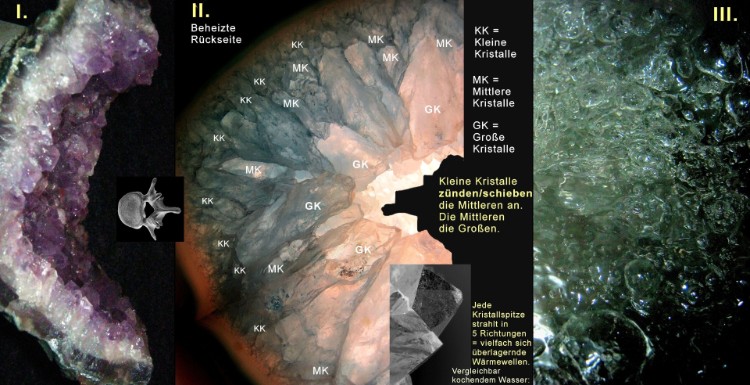 Dies ist eine neuartige Hyperthermieanwendung: die 5-seitige Oberfläche einer jeden Kristallspitze (mitte, II. unten) strahlt in 5 Richtungen. Der daneben gewachsene aber unterschiedlich ausgerichtete Nachbarkristall ebenso. Somit überschneiden sich deren Wärmewellen und bauschen sich auf und überlagern sich turbulent (vergleichbar im Bild rechts = III.). Nur besteht eine Kristalldruse/fläche aus Unmengen von Spitzen, welche zusätzlich von unteren kleineren Kristallformationen "angefeuert" werden.