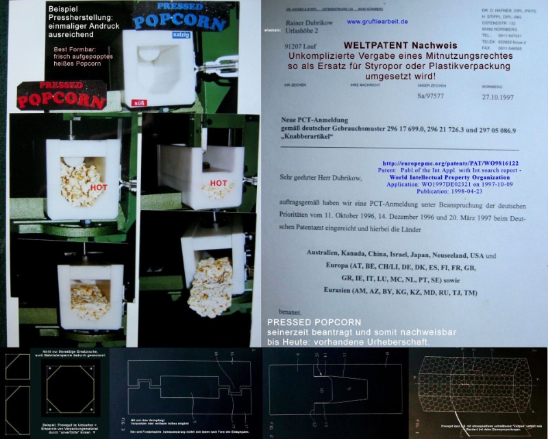 Hintergrund: habe vor Jahren ein WELTPATENT angemeldet, welches das Herstellen und Verpressen von Popcorn als Verpackungsmaterial sowie Verpackungsumhüllung umfasst!