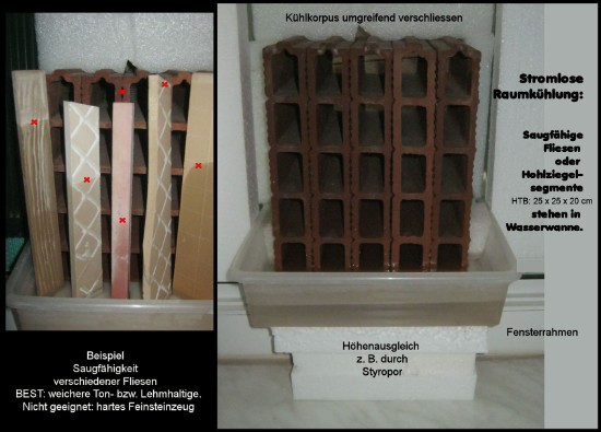 Anmerkung: Ihre eigene stromlose Klima- oder Kühlversion sollten Sie so hoch bauen, wie "die Höhe der Saugfähigkeit ihrer Fliesen" ist! Dafür über Fensterflügelbreite. Drum rum natürlich dämmen, damit Lufteintritt NUR über die Fliesen oder Hourdishohlziegel erfolgen kann!