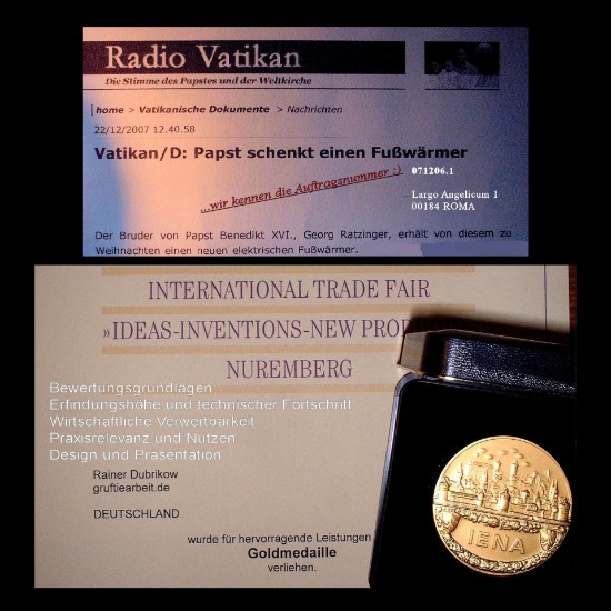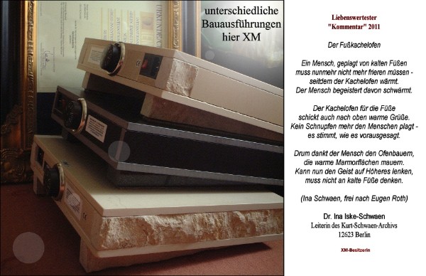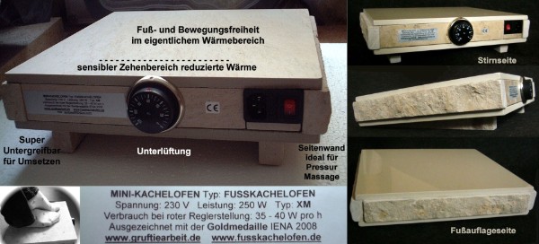 Fußwärmer Auszeichnung:Goldmedallie auf der weltgrößten Innovationsmesse (22 internationale Juroren!) Beliebter und unschlagbarer Fußkachelofen XM: ca. 10 kg schwer (die obere Schalterseite des Ofens ist innen abisoliert. Gut für die wesentlich sensibleren Zehenspitzen = Fußzonengerecht).