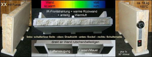 Infrarotheizung mit Umlufterwärmung Typ XX ca. 50 x 30 x 11,5 cm hier mit offenem/geschlossenem Umluftschacht. Mit Verpackung bis 25 kg. Die Frontseiten sind aus Feinsteinzeug und die Seiten z.T. aus Juramarmor. Bei Wandmontage (hängender Anwendung) immer auf Konsolen oder Winkel stellen und gegen Vorkippen sichern! Einfache Winkel, aller Zubehör und Bedienungsanleitung liegen der Lieferung bei.
