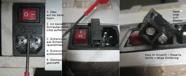 Falls ja mal Sicherung getauscht werden müßte, wäre dies bei uns unkompliziert machbar. Bildanleitung: